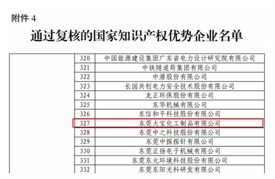 獲此殊榮的企業,須能夠承接國家重大、重點產業發展項目,具備自主知識產權能力,通過積極開展知識產權保護和運用,建立全面的知識產權管理制度和機制,具有知識產權綜合實力。東莞大寶化工制品有限公司于2019年被認定為“國家知識產權優勢企業”,本次順利通過復核,意味著大寶漆自身的科研實力、知識產權建設示范工作再次得到了政府和社會的高度認可。
