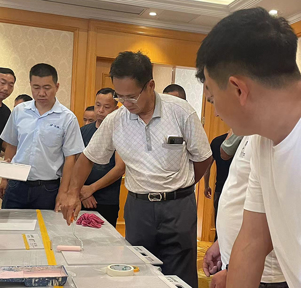 技術部周微老師為大家帶來藝術涂料新品工藝的培訓,大家熱情高漲,積極參與,詳細記錄了各個工序環節的注意事項,60塊樣板全部現場制作完成。加強對經銷商和施工人員的技術培訓,提高其對仿石漆的認知和施工技能,確保產品應用效果。
