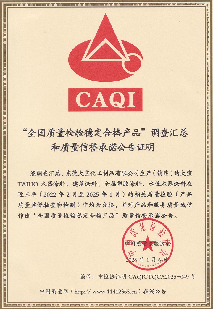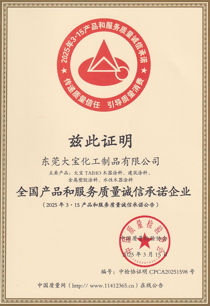 值此國(guó)際消費(fèi)者權(quán)益日之際(2025年3月15日),中國(guó)質(zhì)量檢驗(yàn)協(xié)會(huì)隆重舉辦"產(chǎn)品和服務(wù)質(zhì)量誠(chéng)信承諾"主題活動(dòng)。大寶漆憑借卓越的產(chǎn)品品質(zhì)與優(yōu)質(zhì)的服務(wù)體驗(yàn),在本次評(píng)選中一舉斬獲"全國(guó)產(chǎn)品和服務(wù)質(zhì)量誠(chéng)信承諾企業(yè)"和"全國(guó)質(zhì)量檢驗(yàn)穩(wěn)定合格產(chǎn)品"兩項(xiàng)殊榮。