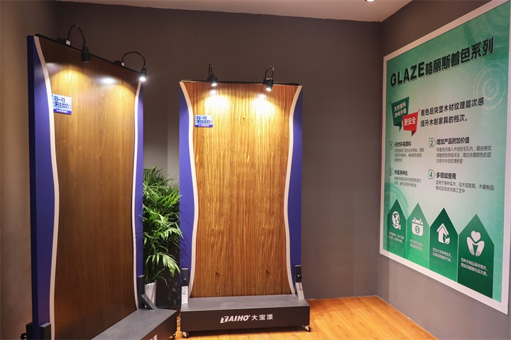 此外,還展示了大寶漆獨創的只需三道色+3道漆的著色工藝——”33透明涂裝系統”和著色后凸顯木材紋理層次的“格麗斯著色系列”。