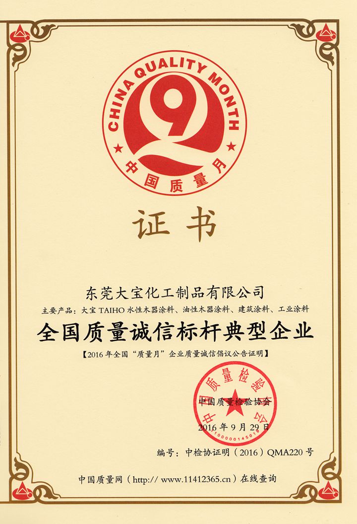 9月29日,中國質監總局、中宣部、發改委、教育部、科技部、工業和信息化部、環境保護部等42個相關部門、行業協會,共同主辦的2016年全國“質量月”活動中,大寶化工憑借過硬的革新技術、產品質量、服務理念,再次榮獲“全國質量誠信標桿典型企業”稱號,并由中國質量檢驗協會授予相關證明證書。