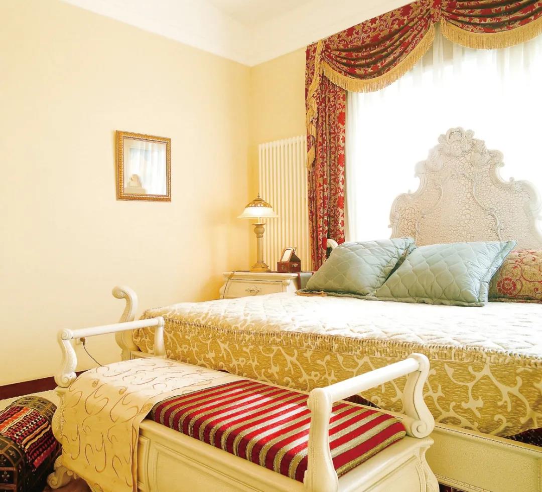臥室統一采用暖色調的配色,墻面大面積使用淺駝色,搭配純度較高的紅色窗簾和床飾進行點綴,給人低調奢華的居家感受。