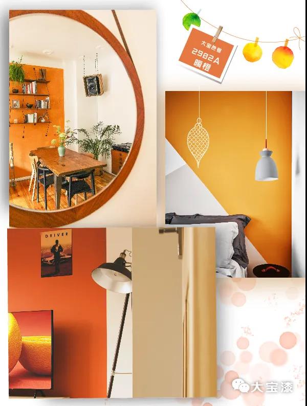 香橙色可作餐廳的布置色,增加食欲;可做臥室背景墻色,愈發溫暖;用作客廳的點綴色,營造空間時尚格調。